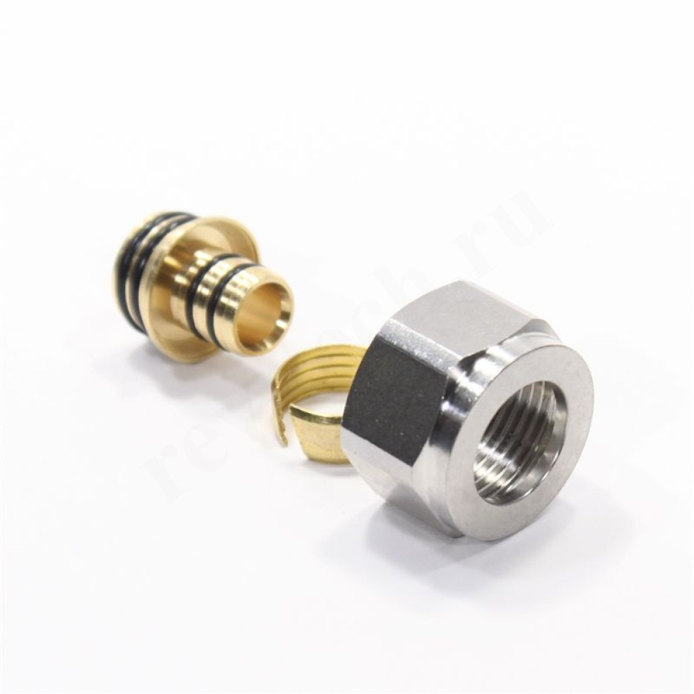 Для подключения труб 17 x 2,0 мм состоит из упорной втулки, разрезного обжимного кольца и накидной гайки.