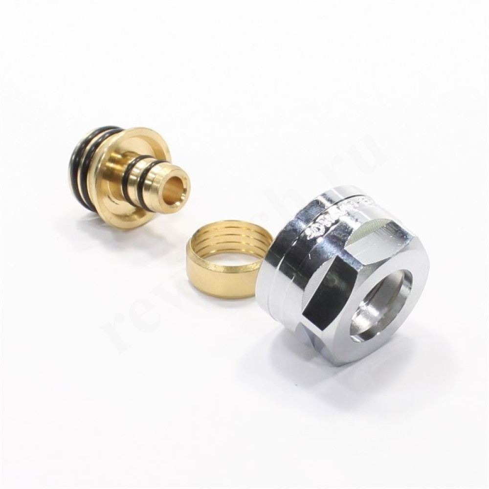 Для подключения труб 16.2 x 2.6 мм состоит из упорной втулки, разрезного обжимного кольца и накидной гайки.