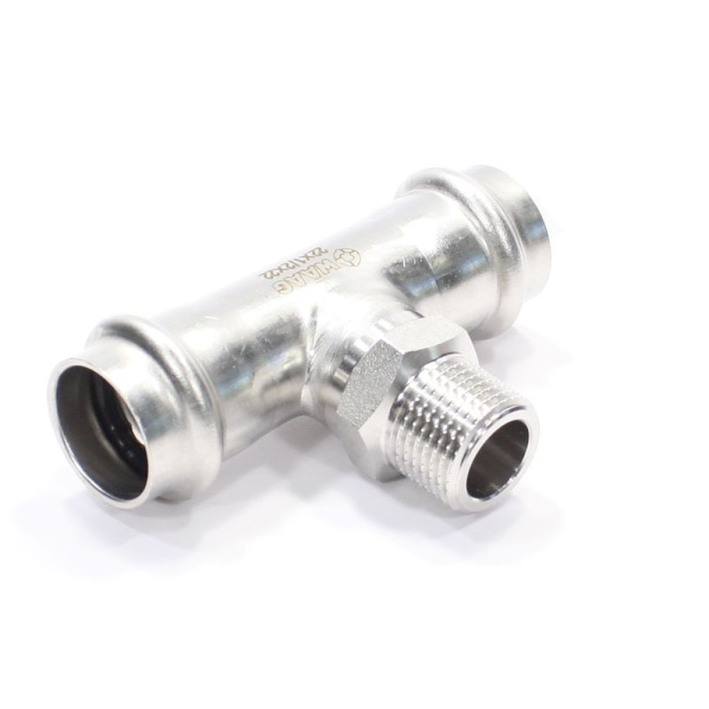 Пресс-тройник из нержавеющей стали с наружной резьбой предназначен для соединения тонкостенных стальных труб с резьбовым элементом системы водоснабжения, отопления, других инженерных и технологических установок. Фитинг рассчитан на эксплуатацию при максимальной рабочей температуре 120 °С. Номинальное давление – 16 бар.