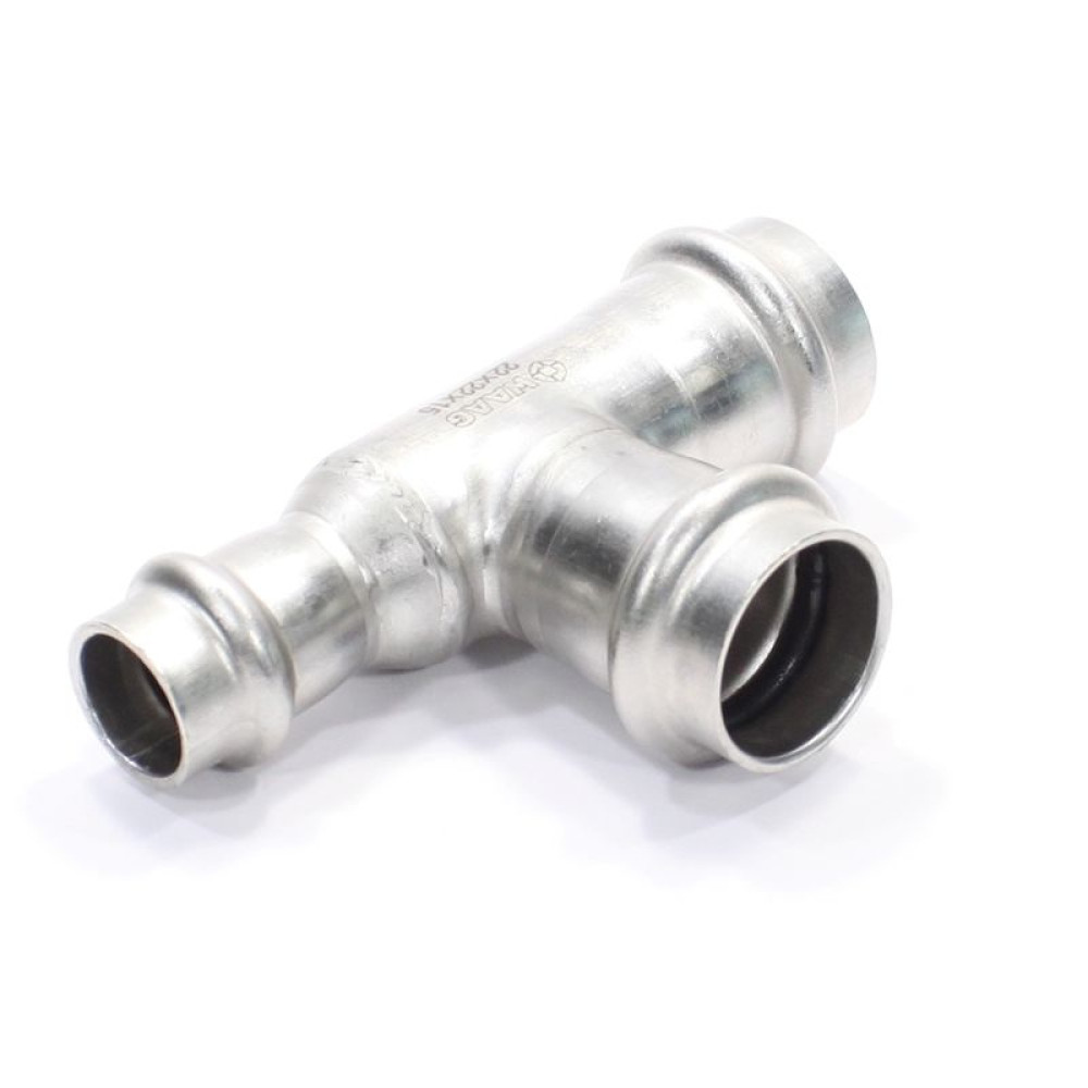 Трехраструбный пресс-тройник из нержавеющей стали обеспечивает соединение трех тонкостенных стальных труб систем водоснабжения, отопления, иных инженерных и технологических установок с рабочей температурой до 120 °С и давлением до 16 бар.