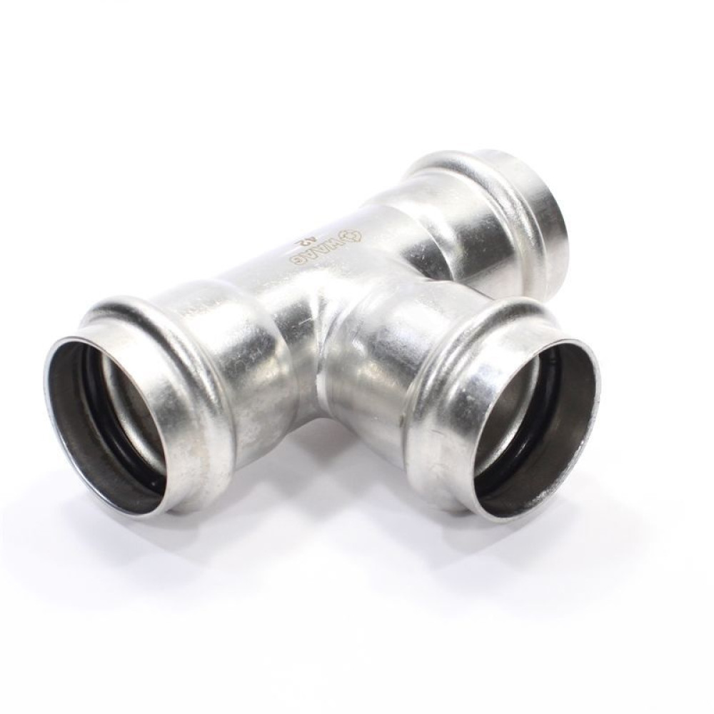 Трехраструбный пресс-тройник из нержавеющей стали обеспечивает соединение трех тонкостенных стальных труб систем водоснабжения, отопления, иных инженерных и технологических установок с рабочей температурой до 120 °С и давлением до 16 бар.
