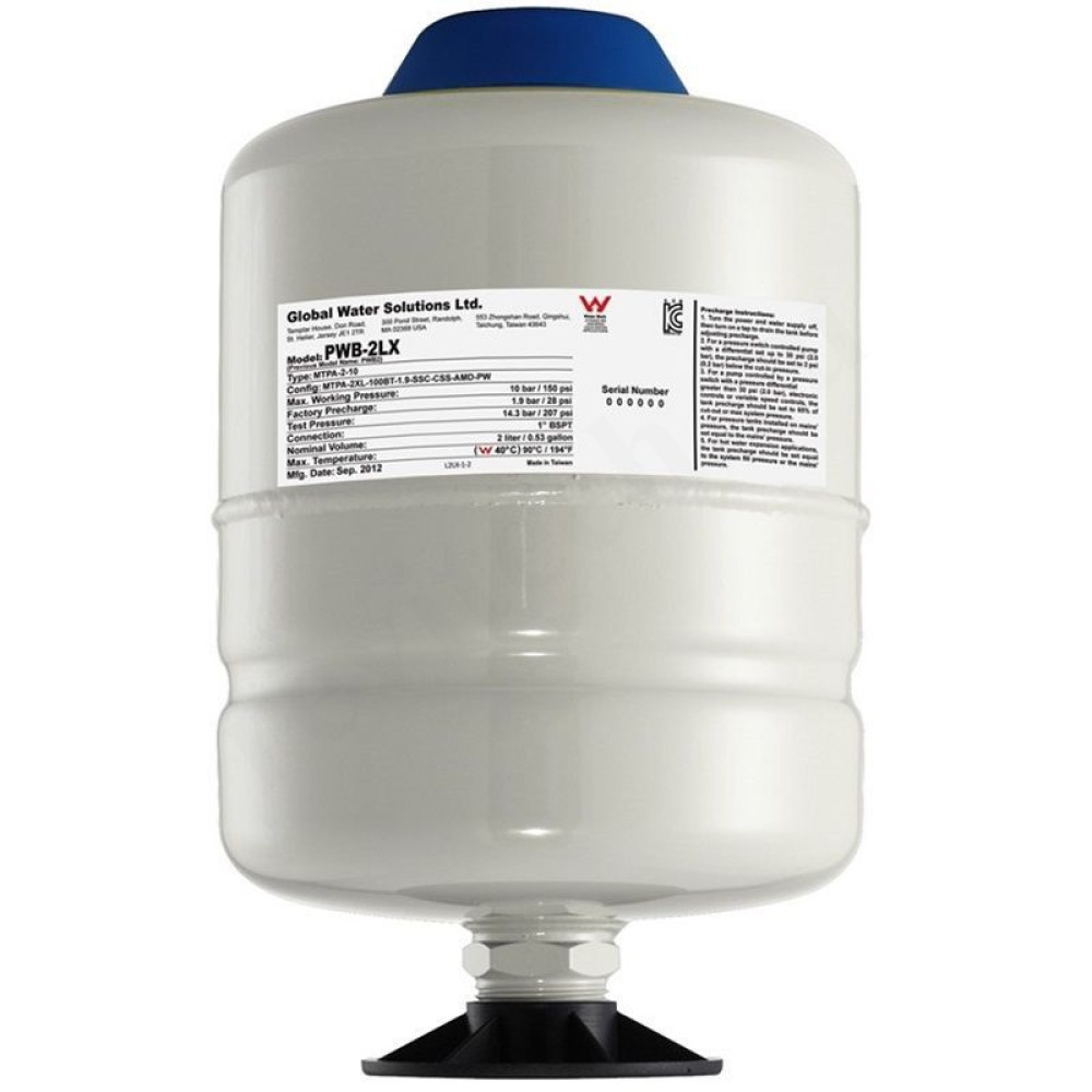 В конструкцию серии Pressure Wave входит цельный полипропиленовый внутренний защитный слой в сочетании с одобренной FDA (Управление по санитарному надзору за качеством пищевых продуктов и медикаментов) высококачественной бутилкаучуковой мембраной. Она фиксируется на стенке бака стальной шайбой под заклёпочный болт. Латунный пневмоклапан с кольцевым уплотнением предотвращает утечки воздуха. Вода входит в бак через запатентованный соединительный патрубок из нержавеющей стали. И мембрана и внутренний защитный слой усилены в особо изнашиваемых областях для увеличения срока эксплуатации. Максимальная рабочая температура - 90°С. Подключение 1". Максимальное рабочее давление до 10 бар. Объем - 2 литра. Подходит для многоступенчатых центробежных самовсасывающих насосов DAB.